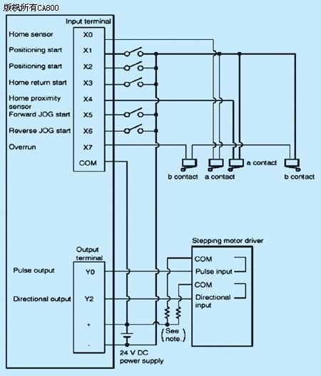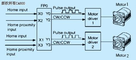 图2 控制系统原理图 3 控制系统的实现 3.1 系统组成 PLC选用日本松下FP0 PLC,共8点输入(X0~X7),8点输出(Y0~Y7),主要控制主电机Motor1和毛斗步进电机Motor2的工作状态和转速;步进电机选用两相混合步进电动机,步距角1.8°/STEP,用于驱动主机和毛斗;步进电机驱动器选用DMD402,电源电压DC14V~40V,其作用是根据PLC的控制指令对电机实现脉冲和方向控制。 3.2 系统工作原理 FP0系列PLC除具有一般逻辑控制与运算功能外,还具有高速计数输入(最大10kHz)、PLS脉冲直接输出、SPD位置控制、PWM脉冲输出等特殊处理功能,用于步进电机的速度控制或位置按制十分方便。 在图3所示系统中:PLC输出口Y0、Y1以脉冲速率方式输入步进电机驱动器的Pulse input端,控制梳理机主电机和毛斗电机转速和位移。PLC输出口Y2、Y3以方向信号输入到驱动器Directional input端,控制梳理机电机的转向。输出点Y4、Y5是步进电机复位信号RST,每次开机对步进电机驱动器清零。PLC输入点X0以梳理机喂入量斗处的红外传感器作为输入信号,可调节喂入量斗的喂毛量。X1、X2作为步进电机的启动信号,X3作为步进电机复位信号。X4以为位置传感器作为输入信号,检测梳理机是否复位。可以利用当需要手动操作时,可通过PLC的手动输入信号X5、X6,以点动方式按制电机的正转或反转。控制关系为:X5=ON,电机正转;X6=ON,电机反转。