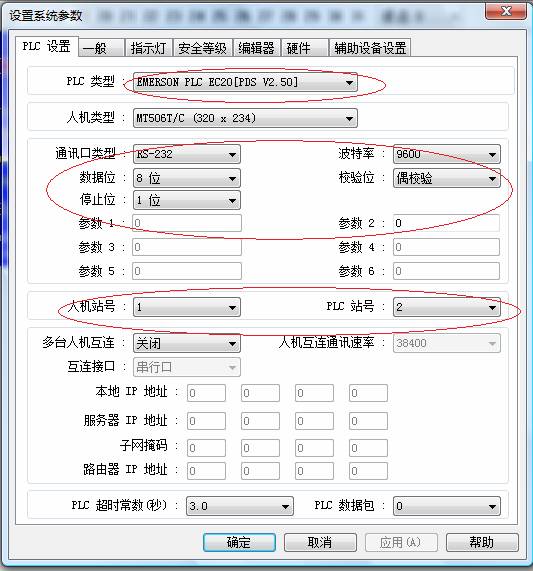 A)、触摸屏和PLC的连接通过RS232端口进行,PLC的类型选择EMERSON PLC EC20[PDS V2.50].