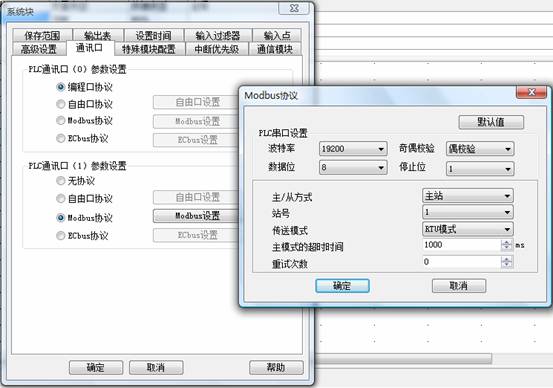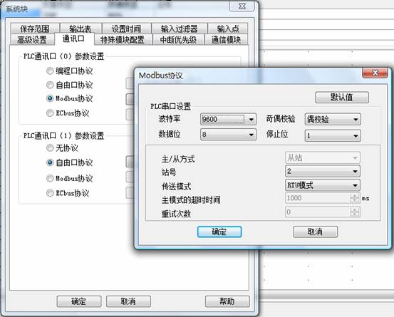 B)、触摸屏作为主站PLC作为从站,采用MODBUS主从式协议进行通讯,PLC从站地址选择为2,触摸屏主站地址设置为1.