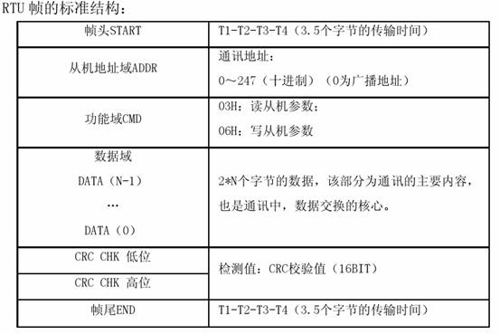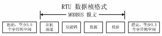 在RTU模式中,帧总是以3.5个字节的传输时间静默,作为开始。RTU的数据格式为: