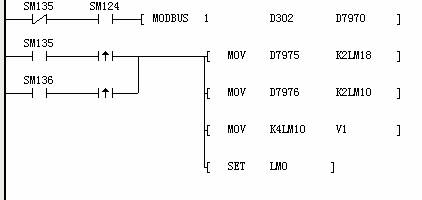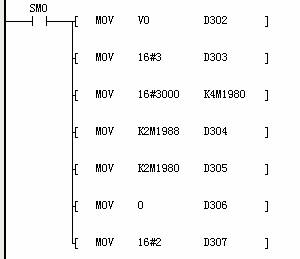 通讯组帧功能部分,通过字数据传输指令(MOV)可以将数据组成通讯帧,从D302开始到D307结束。艾默生的MODBUS协议自动在通讯帧的后面加了CRC校验,不需要使用者计算CRC校验。