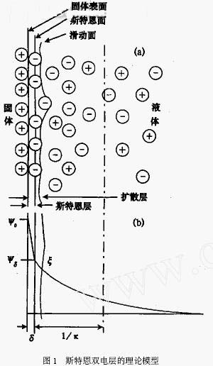 任何固体与任何液体相互接触时,都会使固体表面呈现出带电现象。究其原因主要有以下几个方面: (1) 固体表面对离子的吸附;(2) 离子晶体的溶解;(3) 固体表面的电离;(4) 固体具有n 型(空穴型)或p 型(电子过剩型) 缺陷;(5) 两相对电子的亲合力不同。不管是由哪种原因引起的,当固体表面带电以后,它必然要吸引等量的反极性电荷在其周围。这样在紧靠带电固体表面处就形成一层特殊的表面层———双电层。双电层的经典理论有以下三种:德拜—尤格尔理论;古依—查普曼理论;斯特恩理论。其中斯特恩理论对实验结果的解释至今绝大部分仍然是正确的。斯特恩双电层的理论模型如图1 所示。从图中可以看出,双电层由一个称为斯特恩平面的平面(实际上是一个假想平面) 将它分成二部分:内层为斯特恩层,外层为扩散层,在扩散层中,反电荷离子富集。