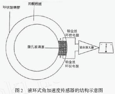 根据流动电势效应制作的液环式角加速度传感器的示意结构如图2 所示。其中,液体环由玻璃管吹拉而成;多孔塞用直径10μm 左右的微球玻璃粉烧制;环状电极用铂金丝制作;液体环中的液体用高纯度丙酮制备。