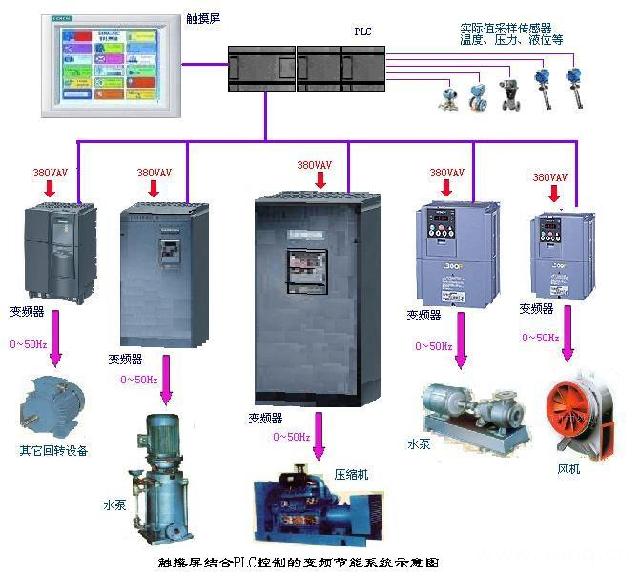 触摸屏和PLC在闭环控制的变频节能系统中的使用,可以让操作者在触摸屏中直接设定目标值(压力及温度等),通过PLC与实际值(传感器的测量值)进行比较运算,直接向变频节能系统发出运算指令(模拟信号),调节变频器的输出频率。并可实时监控到被控系统实际值的大小及变频器内的多个参数,实现报警、记录等功能。一般PLC结合触摸屏的闭环调节的变频节能系统如下图所示。