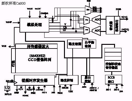 CMOS彩色图像传感器OV7620将CMOS光感应核与外围支持电路集成在一起,具有可编程控制与视频模/数混合输出等功能,能够消除噪声、灯光闪烁等光电干扰,输出清晰、稳定的彩色图像。OV7620的功能特点包括:单芯片1/3寸镜头,最大664×492像素分辨;I2C控制,标准SCCB接口;开窗功能,局部图像输出;输出RGB/RawRGB/YCbCr视频信号;自动曝光控制/自动白平衡/自动增益控制/自动亮度控制;图像质量控制,包括颜色饱和度、锐度、伽马校正等。