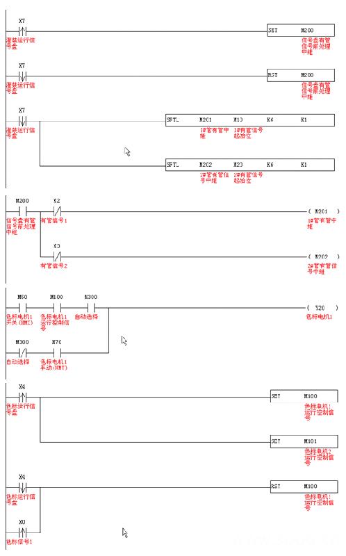 关于色标电机的动作主要和信号盘有信号(有信号时整个环型是不动的),以及当前对标位置是否有管(整个传送带一次移动两个工位每个加工工位是否主要依据两个有管信号检测光电检测并传递,具体处理程序见下图1),再根据色标光电进行自动对标。