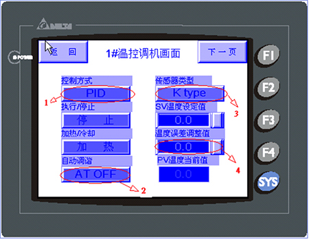 整个系统的整体统配工作有DELTA的DOPA57BSTD的HMI完成。本机尤为特出的是6台温控器的调机工作可以通过HMI的直观、友好、方便、快捷调机画面迅速简单完成极大的方便调机人员,与传统意义上的温控表相比有着相当大的优势。下面为在HMI中组态温控表调机画面: