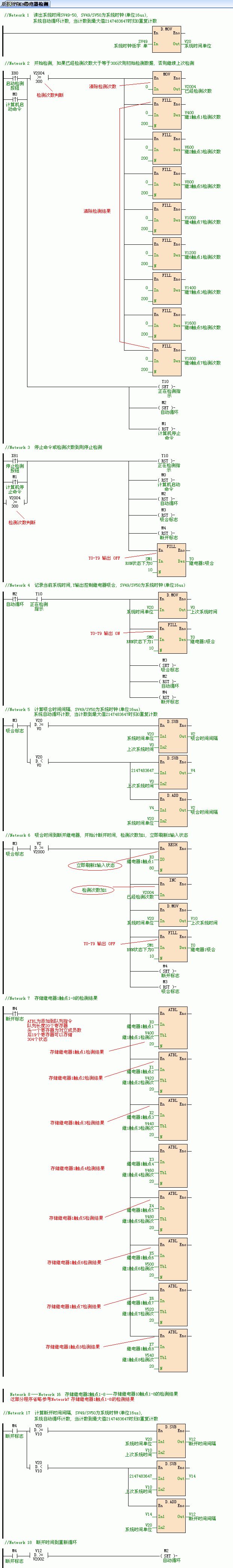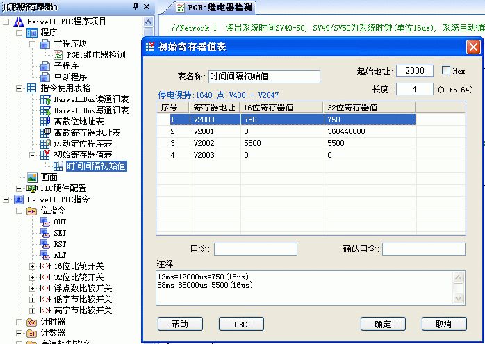 4、需要将检测结果保存在PLC中,要求停电保持,共需要保存80个触点x300个周期合计24000个状态,如果将结果保存在寄存器中则最少需要1520个停电保持寄存器 5、每次检测结束,上位机将结果读出,根据继电器8个触点的吸合情况判断该继电器是否合格 二、该设备对控制系统的要求及海为相应的特点 1、运行速度快:要求程序扫描周期在1.5ms内,海为PLC由于运行速度快,指令集丰富,程序非常精简,实际运行扫描周期为1~1.1ms 2、要有大范围的数据停电保持区:海为PLC的停电保持区可以任意设定,允许将所有数据区都设为停电保持,数据程序无须后备电池保护,永不丢失。不需要用任何指令就可以实现该功能 3、具有ms级控制能力:海为PLC提供一个独有的16us精度系统时间,SV49-SV50为系统时间(单位16us), 系统自动循环计数, 当计数到最大值2147483647时归0不断循环计数。利用该系统时间可以方便实现ms级控制,误差仅一个扫描周期 三、初始化脉冲数据 由于要控制输出12ms ON / 88ms OFF的脉冲,转换为16us时间单位如下: 12ms = 12000us = 750(16us),存放放在V2000-V2001中 88ms = 88000us = 5500(16us),存放放在V2002-V2003中 建立一个名称为“时间间隔初始值”的初始寄存器值表,将ON时间设定为750和OFF时间设定为5500(当然也可以不建立该表而选择在程序中初始化V2000-V2001及 V2002-V2003的值),如下图: