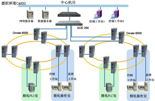 每个控制网络包含热炉板坯区、热风炉、水处理、精轧粗轧卷取PLC、操作室等不同系统。每个节点配置1台Omate6000交换机,分别组成多个子系统。各个子系统之间通过光纤/网线连接到相邻子系统,实现同一通讯链路层之间的冗余。