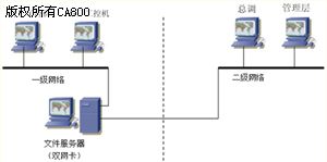 由于此公司各个分厂生产自动化系统比较复杂,IP地址设置也各有不同,按正常思路我们应该把各分厂设备的IP地址统一在一个网段里,但这样在配置时会暂时影响生产设备的运行,所以需要组建二级网络,各分厂原有的网络结构不变,在各分厂调度室或者控制室都增加一台采用双网卡的文件服务器,用其中一个网卡与一级网络相连,另一网卡用于连接二级网络,如下图所示: