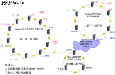 主厂区采用10台Omate6000以太网交换机组成光纤自愈环网,与10个点的原有的以太网交换机通过百兆电口相连,组成主厂区一级网络。二铁厂采用6台Omate6000以太网交换机组成光纤自愈环网,与6个点的原有的以太网交换机通过百兆电口相连,组成二铁厂一级网络。总调室大楼采用3台Omate6000以太网交换机组成光纤自愈环网,与3个点的原有的以太网交换机通过百兆电口相连,组成总调室大楼二级网络。主厂区一级网络与总调室二级网络组成相切环,也就是在环与环直接通过光缆连接。二铁厂一级网络通过54M的无线网络与总调室大楼二级网络相连。