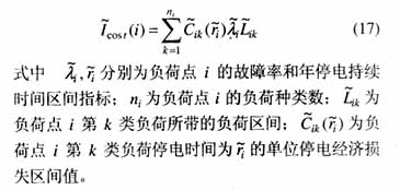 配电系统可靠性区间评估的指标公式形式上与普通评估的指标公式[9>相同,不同的是:网络等值时计算负荷支路和分支馈线的等效参数使用了本文的公式,指标公式中的变量都是区间数所进行的运算,都是区间运算。为使配电系统可靠性区间指标全面,补充一个计算负荷点停电经济损失区间指标的公式如下:
