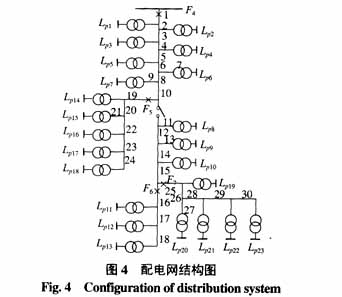它过大地评估了负荷点LP4的可靠性指标。例2 对IEEE RBTS母线6配电系统[9>进行区间评估。如图4主馈线F4带有三条分支馈线F5,F6,F7,元件可靠性原始参数引自文[9>,区间评估过程如下: