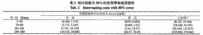 从表3中可看到,所有点值都落在区间值内,但不同的是:区间值能反映出当参数在一定范围内变化时,可靠性指标变化的区间范围,因此只要参数变化不超过预定的范围,可靠性指标也不会超过所得的区间,故可不进行多次点值评估,以减少计算量,且区间评估结果比点值评估结果更符合工程实际,包含的信息量更大。总之区间评估可很方便地计及参数不确定对可靠性指标的影响并进行参数灵敏度分析。从表中数据还可看出,分支馈线向上等效的年持续停电时间区间值和点值相同,都等于断路器配套隔离开关操作时间(因3个分支馈线首端都装设了断路器),而向下等效的年持续停电时间不同,其原因是向下等效的指标是除本身外其他馈线(包括主馈线)对该馈线的等效参数,不同分支馈线受主馈线影响不同,因而等效参数也不同。表4、5为通过向上和向下计算可靠性指标求得的部分负荷点及系统的区间指标和停电经济损失。