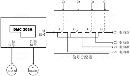 当C1有效时,开关K1闭合,DMC303A的Z向信号经分频器送到驱动器Z1上,实现对Z1轴的可选择性控制,依次类推。当C1、C2、C3、C4同时有效时,开关K1、K2、K3、K4同时闭合,使得Z向四轴能够同时运动。鉴于我们的四轴数控钻床Z1、Z2、Z3、Z4工作轴的运动是同步运动或同步静止两种状态,所以可以通过C1、C2、C3、C4的预先设置,来实现一路信号控制四个轴的运动。 |