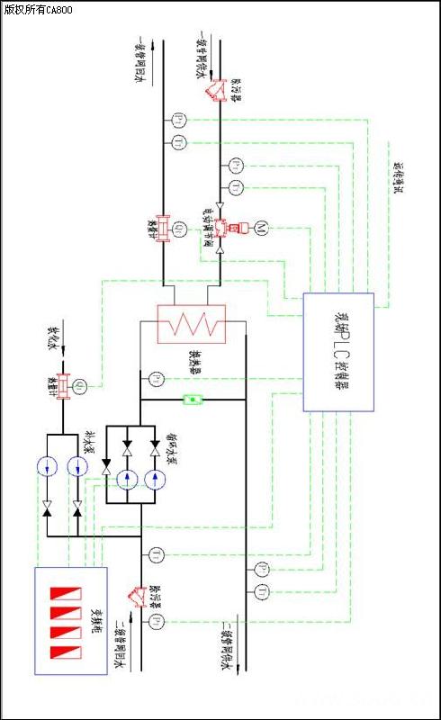 系统根据二次网供、回水平均温度的温差,通过变频器自动调节循环泵的转速,实现对系统总流量和温度的调节。使循环水泵按照实际负荷输出功率,减少不必要的电能损失,实现小流量大温差的运行模式。通过此举,可以及时地把流量、扬程调整到需要的数值上,消除多余的电能消耗,从而达到良好的节能效果。通常热力系统会设计两台变频泵,这不仅是为了系统备用,也是为了防止系统超调。如果负荷不够,则泵的转速加大,达到100%时还不满足要求,则启动第二台泵。同时系统还可以根据运行时间自动切换各循环泵,也提供低水压保护和连锁功能。
