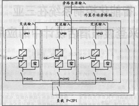 图5:并联UPS系统由相同的单机和公共外部手动维修旁路。这种并联连接是为了增加UPS总容量同时提供冗余配置。比如3台相同容量UPS并联,如果1台故障,可由另外两台UPS向全部负载供电。可有1/3冗余度。
