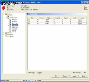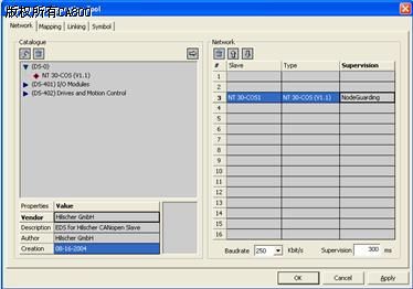 通过 Import按钮,添加从站EDS文件,德国赫优讯NT30-COS-RS的EDS名为“”,可通过多种途径获得,如赫优讯网站、netTAP光盘或咨询赫优讯上海办,EDS信息加载后,选中NT30-COS-RS,左下角会显示产品的基本信息。此时即可以双击添加从站,可添加多个从站,根据施耐德 CANopen主站模块信息,最多不超过16个接受PDO和16个发送PDO,如果每个从站设备的PDO数量不同,则连接的从站数量也将随之变化。从站地址可根据从站的实际地址进行对应,通过 上下键进行地址的选择,赫优讯NT30-COS-RS的从站地址通过拨码开关设定(一般从站地址的设定方式有两种:一种通过硬件设定,一种是通过软件设定),设定从站地址为3。另外需要对主站监控从站状态的方式进行设定,可选方式有:保护时间、心跳或不设定,本例中选择保护时间。