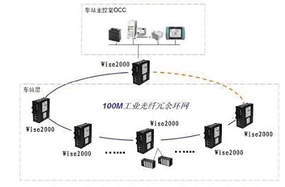 本系统是由1个车站主控室和19个地铁站组成,每个车站距离不等,信息量基本一致,整个工程全长为21公里,采用传输距离为40公里的WISE2000工业以太网交换机。车站主控室通过工控机连接到工业级100M冗余环形网络上并在人机界面上控制每一个站点的信息,同时也可读取每个站点的网络数据。