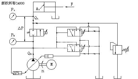 如图一所示:A1:油缸无杆腔活塞面积 F:工作负载 Q1:工作流量 P1:工作压力 △p:比例调速阀两端的压力差 Qy:比例溢流阀流量 Pb:油泵压力,Qb:油泵流量 Vb:油泵排量 n:电动机转速
