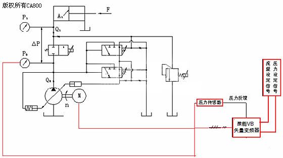 微能公司是将矢量变频技术应用于注塑机电机驱动上,通过速度调节及压力PID闭环控制功能完成对注塑机的精确控制。油路上将比例调速阀人为硬性的将流量调至最大并保持或者拆除,同时切断流量、压力反馈阀对变量泵的活塞的控制。改为矢量变频PID控制维持压力的恒定,自动实现了压力自适应控制,这样系统从源头上消除油路中的节流及溢流能量损失,使注塑机获得最佳的节能效果。系统如下所示: