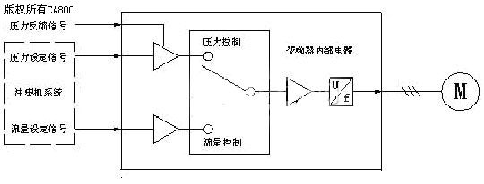 变频器控制系统配备一块智能转换卡,变频器将通过压力传感器实时监控到这一压力变化,并与塑机的压力设定值做比较。当它们差值很小时,变频器的智能转换卡会及时将变频器切换到压力控制状态。,启动PID控制并通过PID功能保持系统压力恒定。此时,变频器的输出频率将与该压力差值成正比。因差值很小,变频器的输出频率及电机转速将迅速降低,油泵仅维持很小的流量输出,以弥补油路中的各种泄漏损失。