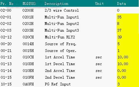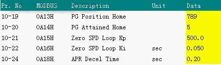 使用脉冲控制时,还有两个参数也是非常重要的:1.10-17PG电子齿轮A;2.10-18PG电子齿轮B。其计算公式为转速=脉冲频率/编码器的点数(10-00)*电子齿轮A/电子齿轮B。