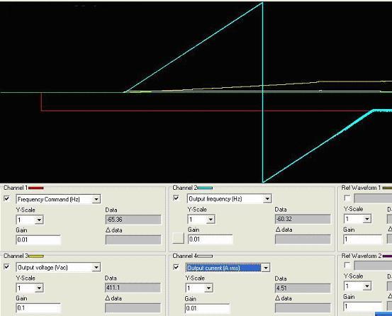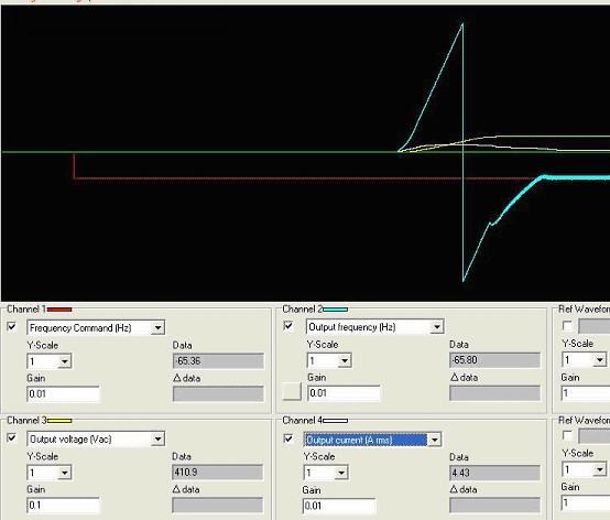从0加速到590hz的加速过程中实测加速时间为1.4s,加速中最大电流为19.3A,图形参见图4。