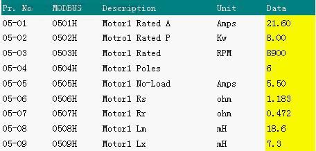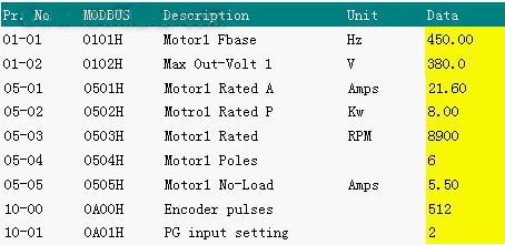 (2)解决一个有趣的工程问题。在以上数据中,电机额定转速05-03是电机厂家铭牌没有提供,询问电机厂家也不是很清楚。这种情况下,由于电机本身带编码器,通过VF控制,将变频器运行到450hz,观察变频器中提供的r状态,电机实际转速为8900rpm左右,将测的数据填入到05-03。电机额定电流25A,075V43A-2变频器额定电流只有18A,所以只能将电动机额定电流尽可能的调整到最大(最大为21.6A)填入05-01参数。