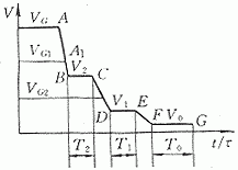 (1) 初始速度VG经AB段以加速度a2降速到V2,在BC段以V2匀速运行T2个采样周期,用BC这个时间段来补偿减速点A的误差。A点最大误差是VG对应的一个采样周期的脉冲数NG=VGτ/δ,速度为V2时一个采样周期的脉冲数为N2=V2τ/δ,则只要保证T2≥NG/N2=VG/V2,就可以使BC时间段补偿减速点A点的误差。