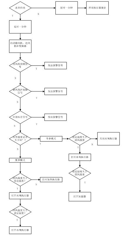 系统启动后,要先延时一分钟,然后启动送风机(do输出),排风机(do输出)和(控制送风机的)变频器(ao输出)。由于整个系统是定静压系统 所以也需要对变频器做pid控制。此时风机若正常工作 ,必然在风道内有压差,故在开始检测水温、判断工作模式前,需先检测系统是否故障,若有故障,根据传感器信号相应报警;无故障,有水温检测传感器,判断水温度,若大于30°,则空调系统工作在冬季模式。