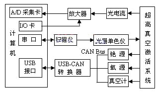 根据GaAs光电阴极制备工艺的要求,我们设计了如图1所示的GaAs光电阴极制备测控系统原理框图。该测控系统由三大部分构成:超高真空激活系统、计算机和外围测控设备,其中超高真空激活系统是用于GaAs光电阴极制备(加热净化和铯氧激活)的,制备过程中的多种信息量可通过外围测控设备与计算机相连。测控设备共分两部分,一部分完成光电流、光谱响应曲线的测试,另一部分完成真空度的测试以及铯(氧)源电流信号的测试和控制。