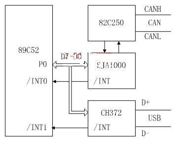 USB-CAN转换器实现USB与CAN两种总线之间的协议转换,如图2所示为其结构框图。图中微控制器89C52负责转换器的监控任务以及CAN与USB总线的通信任务。CAN控制器接口电路采用SJA1000和82C250,USB控制器接口电路采用USB通用设备接口芯片CH372。在微控制器中,USB与CAN总线报文的接收均采用中断方式,这种方式能尽量减少时延,提高系统实时通信能力。