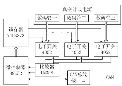 在真空度、铯(氧)源电流信息的测试方面,为了保持采集数据与设备显示数据的一致性,采用的方法是将设备数码管上显示的信息直接取出。真空计和模拟电源的显示均由3位数码管构成,所以两者可以采用相同的测试电路。如图3所示为多信息量测试模块结构框图,图中真空计或电源的3位数码管分别与一片双四选一的电子开关CD4052相连,微控制器从锁存器输出地址选通信号,控制CD4052依次输出数码管8段显示信息中的2段,连接到比较器LM358上,经比较转换为标准的逻辑电平后输出给微控制器,最后微控制器将3个数码管的信号组合在一起,得到真空计或电源上显示的数据。在这里采用比较器的主要优点是可以根据不同数码管的驱动电平灵活的调整比较电压,而且输出逻辑电平稳定,从而使测试电路具有更好的适用性。采集到显示信息后,可在微控制器控制下,通过CAN总线传输给计算机。