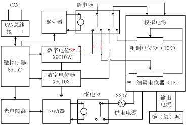 在原有的系统中,铯(氧)源电流大小的控制是通过手动调节电源的模拟电位器来实现,而为了实现计算机对电流大小的数字化控制,最直接的办法就是用数字电位器取代电源的模拟电位器,按此方案设计的电流控制模块结构框图如图4所示。电源有一个10K的粗调电位器和一个1K的细调电位器,分别用10K和1K数字电位器X9C103、X9C102取代,图4中两个数字电位器是串联在一起的,这种接法可使电流控制精度更高,而实际控制精度超过了模拟电源的三位显示精度,这完全能满足系统对电流控制精度的要求。数字电位器或模拟电位器的选择可由微控制器输出控制信号,经过驱动后控制双刀双掷继电器来确定。微控制器也可以输出控制信号来控制继电器接通或断开模拟电源的外接220V供电电源,从而实现铯(氧)源电流的通断,同时由于控制的是220V交流电源,在微控制器和驱动器之间必须进行光电隔离。计算机可通过上述方式来实现阴极制备过程中的自动铯氧交替。