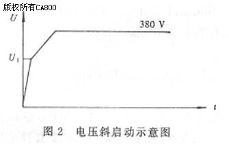 ( 2 )电压斜坡启动控制模式 : 如图 2 所示, U 1 为电动机启动所需最小转矩对应的初始电压。当电动机启动时,软启动器的输出电压迅速上升到整定值 U 1 ,然后按设定的速率逐渐增加,直至达到电网电压后,接触器吸合,启动过程完成。