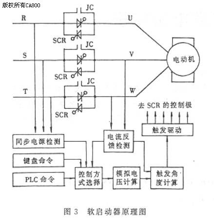 软启动器的工作原理是:软启动器收到启动命令后,便按所设定的启动方式进行有关计算,确定可控硅的触发输出电压信号,以控制电动机的启动过程。当电动机的启动过程完成后,软启动器便控制交流接触器吸合,短接所有可控硅,使电动机直接投网运行,避免不必要的能源损耗。图 3 为软启动器的原理图。