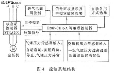 控制系统结构如图 4 所示,主要包括软启动器、可编程控制器、压力传感器、进气电磁阀。