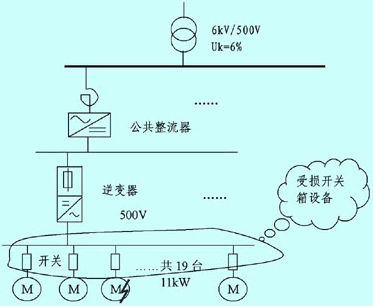 辊道传动最初采用单台电机通过机械齿轮箱成组驱动多个辊子;后来发展为单台电机不经过齿轮箱直接驱动单辊的传动方式,辊道传动由一套调速装置集中给多台电机供电,每台电机直接驱动单辊。如某热轧厂精轧辊道采用西门子MASTERDRIVE 6SE70变频器供电,采用VF控制或无速度编码器的矢量控制。 2、辊道传动的特点 (1)由于同一组辊道的速度一致,电机的速度也一致,可以进行集中控制,但集中控制精度不高。 (2)由于每台电机的性能不可能完全一致,每个工作棍磨损程度不同,以及传送轧件不规则,都会导致部分电机的负荷比较大,部分电机的负荷比较小。由于调速装置不能很精确地对每台电机进行控制,当负荷增大时,只能笼统地使总输出电压与电流提高,导致负荷轻的电机端电压可能超过额定值,造成电机的绝缘劣化,特别会造成交流电机磁路饱和,电机电流增加,发热增加。所以对每台电机必须配置过载保护。 (3)当开关箱至每台电机的电缆长度不一致或电缆细时,由于线路压降也会造成电机的端电压不一致,从而造成部分电机的端电压减少,输出力矩下降,甚至堵转,电机电流特别大。所以,对成组传动装置,要求电机的参数尽量一致,而且配置的电缆也要尽可能短。 (4)在传送轧件时,轧件可能受堵,导致电机堵转,为了避免辊子堵转,要求电机与轧件之间打滑,即必须使电机的最大转矩大于打滑转矩。所以在系统设计时,传动装置及电机都要有一定的过载能力。 (5)辊道电机一般离调速装置的距离比较远,电缆很长,而现场环境比较恶劣,高温、潮湿、腐蚀性气体,导致电缆及电机的绝缘下降。另外,变频器输出电压是PWM波形,当电缆两端阻抗不匹配时,会产生行波反射,在电机端电压峰值可达到变频器主回路直流电压的两倍,也会造成电机及电缆绝缘劣化。 (6)当一套调速装置带数台辊道电机时,为了保证调速装置与电机的安全,在设计时必须进行容量匹配计算与各级保护之间的匹配,避免误动与拒动。 3、故障现象 某热轧厂精轧GF17辊道共有19台11kW的电机,每台电机额定电流为18.5A,总额定电流为351.5A,变频装置的额定电流为560A,采用无速度编码器的矢量控制,过载能力为136% 1min。在变频装置输出到每个电机之间各配置一只额定电流为100A开关,过载整定在28A,过流瞬动电流为1000A,短路分断能力为40kA。所有开关集中安装在一个开关箱内,开关箱安装在地下电缆沟内。系统框图如图1所示。