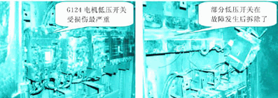 2006年8月24日,GF17辊道中的G124电动机开关跳电,现场人员至电缆沟开关箱送上G124开关,返回操作室后发现监控系统又报G124电动机开关跳电,当现场人员再次来到电缆沟时发现该开关已烧损,触头粘连,箱内临近的开关也有不同程度的烧损,G124电机电缆也烧坏,对G124电机进行检查时,发现该电机接线柱由于锈蚀与松动,导致三相短路。故障处理与恢复时间大约为8h。辊道开关箱损坏如图2所示。