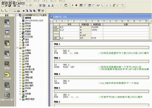 起始位 即帧头以至少3.5个字节的传输时间停顿间隔作为开始.依次传输一帧数据直至结束 Bit1 从机地址 变频器为从机,变频器的本机地址即为PLC通讯的从机地址,由变频器的参数设定(H-67) Bit2 命令代码 主机发送的命令代码,对从机进行相应的操作,如03H读从机参数、06H写从机参数、08H回路自检测。 Bit3 / Bit4 数据地址高位/低位 即从机数据地址 Bit5 / Bit6 数据地址高位/低位 即从机数据地址里面的内容 Bit5 / Bit6 CRC校验低位/高位 采用西门子S7-200PLC编程如下: 1、CRC校验子程序编写 首先将编程端口PORT0(PORT1)通过对SMB30(SMB130)设置,即偶校验(E、8、1)和波特率的值的内容。对PLC进行初始化。并编写CRC校验子程序。收此时的编程端口无法进行状态监控。子程序使用了多个局部变量,以方便其它子程序调用。 在西门子STEn 编程环境下(如图1) 设置变频器以下参数:H-66=0//变频器设为从站 2、速度链子程序 按照我们上面所述的比例关系式来设计子程序。利用浮点运算处理,调节比例系数时可达到变频器的最大分辩率,即0.01HZ。 3、RS发送格式子程序 以每隔30MS发送一帧数据,不断循环发送。经实践证明效果很好。 4、其它 注意单位时间内的升降值(分辩率)的限幅,主机升降速度和从机升降速度一定要分为两个定时器编写。 5、见上图所示,在输入点采用了组合方式输入,节约了大量的输入点,有效的降低了成本。 七、结束语 采用PLC同变频器通讯,很容易实现多变频器之间的同步和比例联动运行。该系统具有成本低、信号精度高(可达变频器最高分辨率)、传输距离远、抗干扰性强等特点。我们以这种方式做了几十套控制系统,用户反映非常好。具有接线简单,控制精度高,成本低等特点,特别适合对多台变频器的同步、比例联动以及对变频器频率精度要求比较高的场合。 | |||||||||||