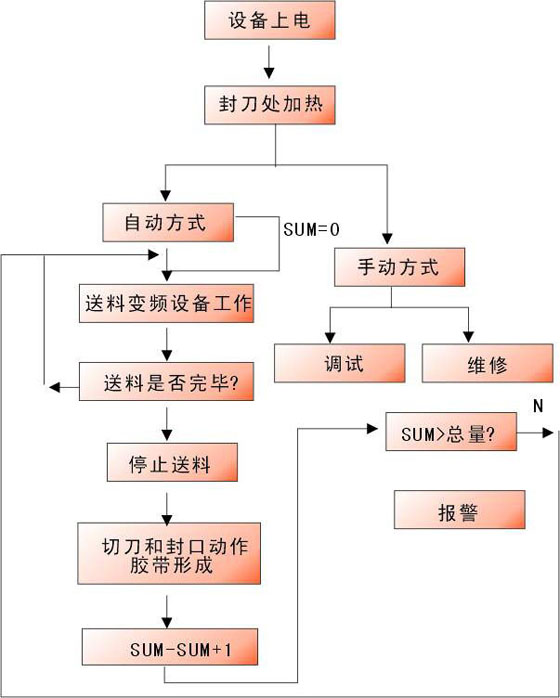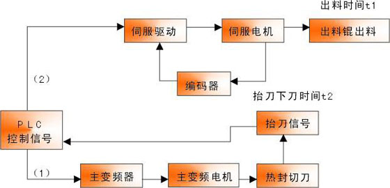 (1)设备上电后,温控器控制封刀处加热器进行加热。(2)自动起动后,送料变频器驱动送料电机以设定的速度输送塑料薄膜,送料感应器检测到送料端放卷的塑料薄膜足够时,送料电机停止送料。(3)温度到达,温度信号导通,主变频器驱动主电机通过机械传动装置控制切刀和封刀的上下往复运动。(4)切刀每向上运动一次,伺服信号导通一次,伺服电机驱动出料辊夹着塑料薄膜带转动一次,切刀和封刀下切,胶袋形成 。(5)设定个数到达或按停止键时,当前胶袋形成后停机,切刀和封刀停在高位停车处。