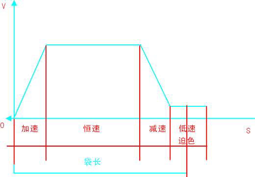 新型制袋机均带有两种封切方式:一种为空白袋封切方式,即伺服系统控制电机以PLC预先设置的脉冲数进行动作,直到脉冲数运行完为止,作为一个制袋周期,此种方式为非追色运行方式,也称为定长运行方式。另一种为追色封切方式,当选择追色封切时,其过程如下,伺服启动信号导通,伺服电机按照PLC程序预先设定的运动曲线进行加速运动、恒速运动、减速运动、低速追色,如图5所示,PLC接收到追色信号时,通过中断方式立即停止伺服电机。一般追色长度为10mm,并且要求追色信号只能在追色范围内起作用,其它范围内需屏蔽掉其干扰信号。追色封切调试时,在人机界面上设定好伺服电机的恒速速度,先将加速时间、减速时间设长,再调低速追色速度,尽可能提高低速追色速度,以追色平稳、准确为准。调整好追色速度后,再调加速时间、减速时间,尽可能调短加减速时间,以胶袋与出料辊不发生相对滑动及追色平稳为准。PLC程序在追色封切时,对追色信号记数,连续三次检测不到时,PLC停止各电机运转,并驱动报警器报警。同时PLC程序对批量记数,当批量达到预警值时,PLC驱动报警器报警提示。