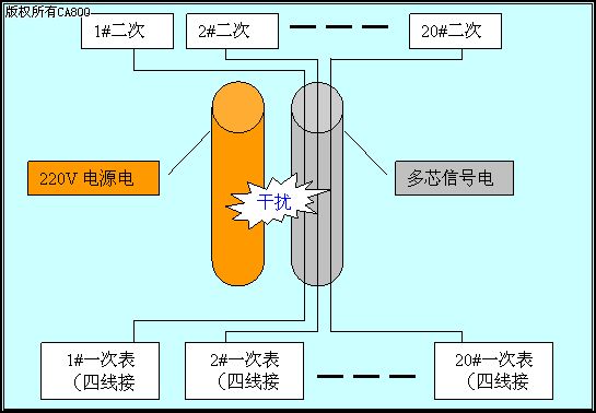 方案一:全部更换受干扰的信号线。重新布槽线盒,更换多线电缆为三芯电缆,每块一次表单独一根电缆。