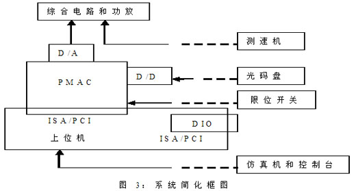 图中,PMAC控制卡通过标准总线与上位机相联,码盘等测速或测角机构通过PMAC上的DD接口传递位置、速度等信息,经PMAC处理,并按上位机给出的控制要求通过PMAC上的DA接口输出合适的电平信号控制转台上的电机运动,从而构成控制闭环。