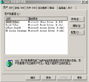 在Windows 操作系统的控制面板中,依次点击性能与维护→管理工具→数据源,弹出图四所示的ODBC 数据源管理器
