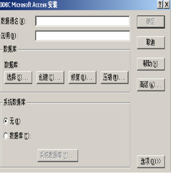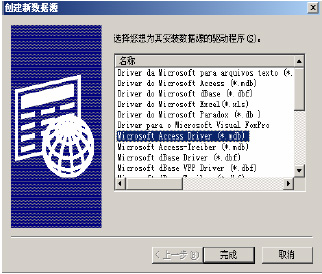 (图5)的驱动程序列表中选择“Microsoft Access Driver(*.mdb)”,并单击“完成”按钮,在随后出现的对话框(图6)中的“数据源名(N)”一栏中创建DSN 的名称,并单击“选择”按钮选择需要访问的数据库,按“确定”按钮结束。