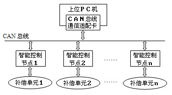 功率因素动态补偿系统对低压电力系统的无功功率进行实时监测、动态补偿,对电网运行状态和负载用电状态通过电压、电流互感器间接监测。本系统在保证系统可靠工作和降低成本的条件下,考虑到通用性、实时性和扩展性等方面的因素,采用了主要由上位计算机系统和网络节点模块构成的系统结构。系统的总体结构如图1所示。智能节点通过对各个模拟量和开关量信息的采集检测,达到电力的合理调配,并且将有关参数通过CAN总线控制器由CAN总线传递给上位机。上位机完成故障录波、自动数据分析、人机界面显示和报表打印等。补偿单元是由电容器组和晶闸管触发电路组成,它根据智能节点的解算值投入电容器来产生补偿电流注入低压电网,以此补偿无功功率。