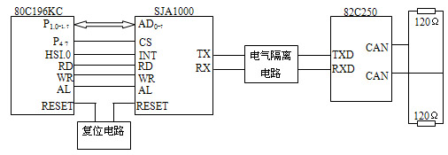 SJA1000的AD0至AD7是分时复用地址/数据线,与单片机的系统总线引脚P1.0 至P1.7相连作为单片机的外部扩展存储器。SJA1000的INT脚与HSI.0脚相连,当中断允许时,一旦有中断发生,SJA1000的16脚INT就会被激活,出现一个由高电平到低电平的跳变,而80C196KC的外部中断HSI.0接受这一中断信号后,CPU随即响应中断,由执行其他任务转向为执行该中断任务。