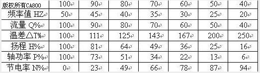 对于水泵来说,流量Q与转速N成正比,循环水温度△T与转速成反比,扬程H与转速N的二次方成正比,而轴功率与转速N的三次方成正比,见下表: